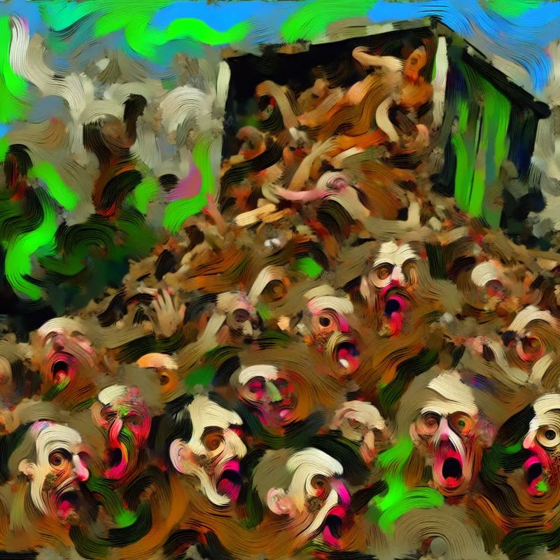 Abstracte weergave van een putrid afvalhoop met uitbarstingen van walgelijke kleuren en vervormde figuren die afschuw tonen.