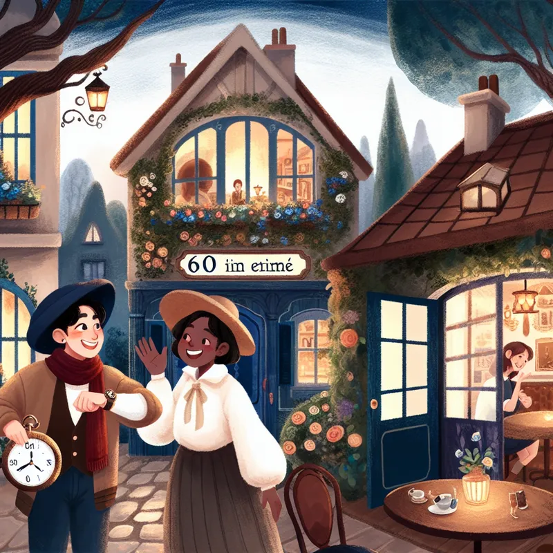 Twee vrienden ontmoeten elkaar in een charmant café met vintage meubels en een bloeiende patio, één met een horloge en de ander die zwaait.