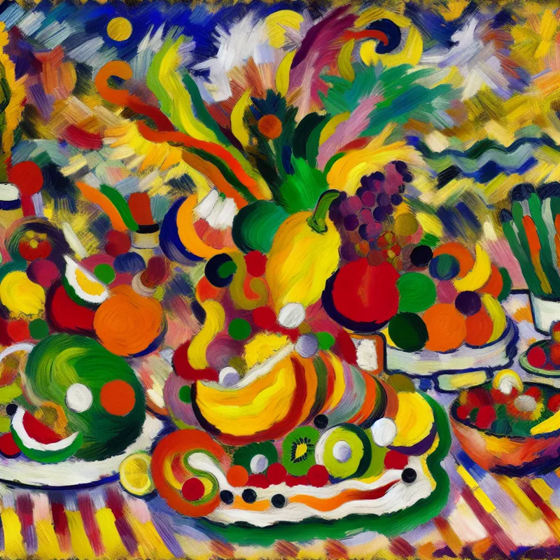 Abstracte afbeelding van een kleurrijke maaltijd op een tafel met een verscheidenheid aan vruchten en groenten in speelse, energieke opstelling.