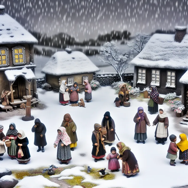 Dromerig winters tafereel met een besneeuwd dorp, koude bewoners en spelende kinderen in zware kleding.