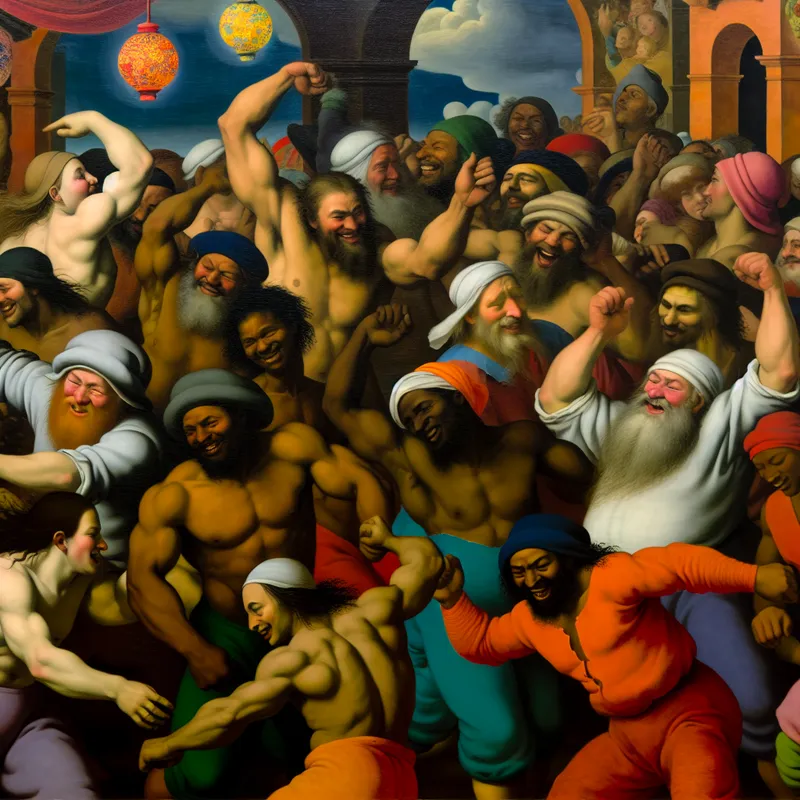 Een grote, diverse groep mensen viert vreugdevol samen met kleurrijke versieringen op de achtergrond.