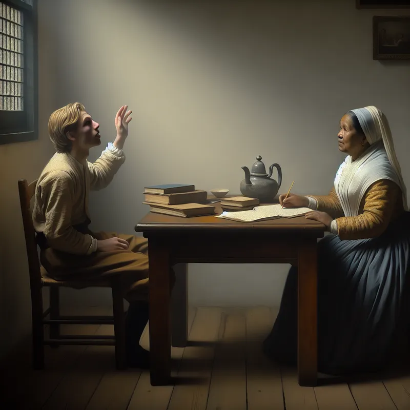 Een serene kamer met zacht licht, student aan tafel vraagt beleefd om hulp