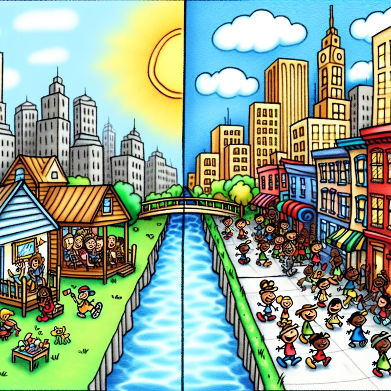 Een vrolijke cartoonafbeelding van twee verschillende steden naast elkaar, met een brug en een rivier ertussen.