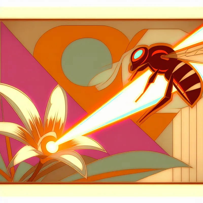 Retro-futuristische illustratie van een bij met een prominente angel boven een bloem, die de scherpe structuur van de angel toont.