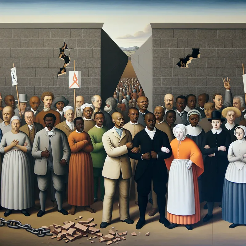 Groep diverse mensen die samen staan voor een muur als symbool van eenheid en verzet tegen apartheid in Zuid-Afrika.