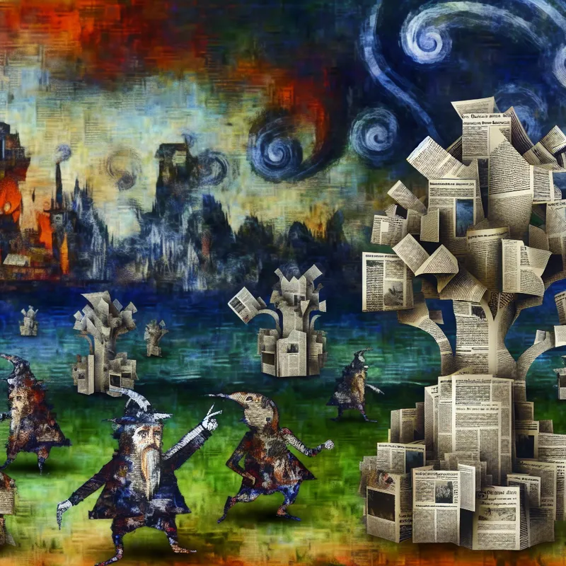 Surrealistisch tafereel geïnspireerd door Hieronymus Bosch met bizarre wezens van inkt en papier die praten over klimaatverandering voor een boom van krantenartikelen.