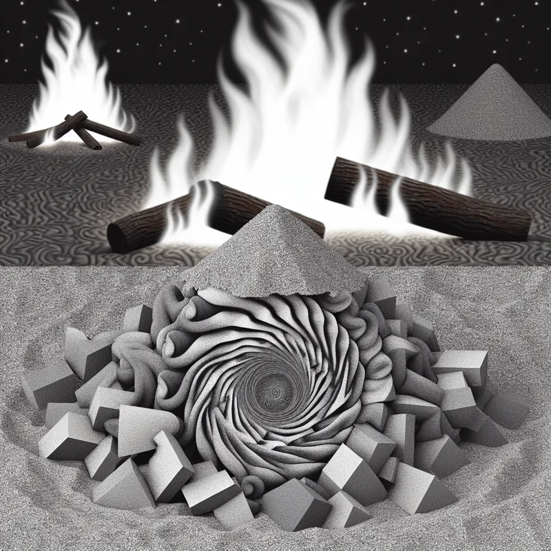 Surrealistische afbeelding van asresten van een kampvuur in geometrische patronen.