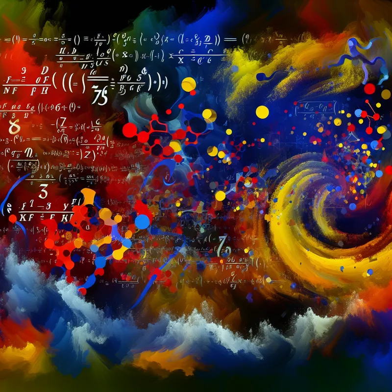 Abstracte compositie die exacte wetenschappen vertegenwoordigt met chaotische, kleurrijke penseelstreken.