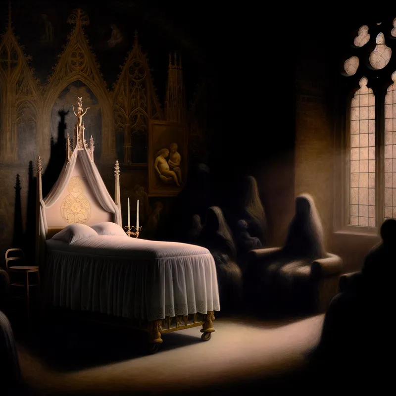 Een donker verlichte ziekenhuiskamer met een prachtig versierd bevallingsbed in het centrum, omgeven door schaduwen en gothic details, en silhouetten van bezorgde familieleden op de achtergrond.