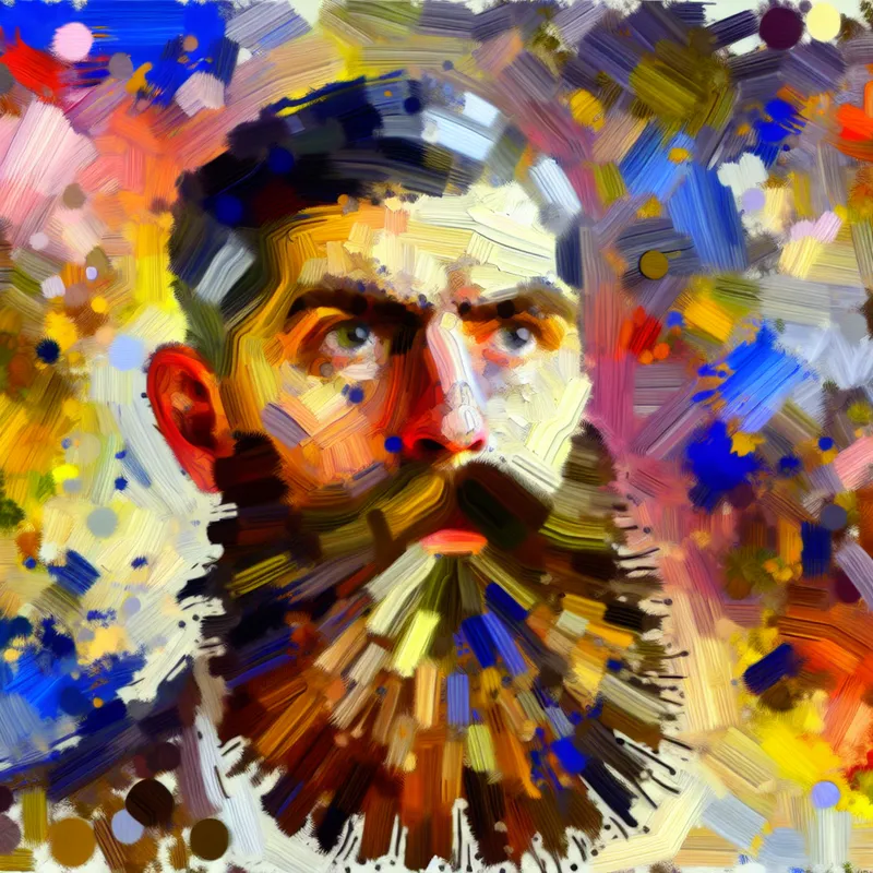 Abstract expressionistisch portret van een man met een volle, mooie baard, geschilderd met krachtige penseelstreken.