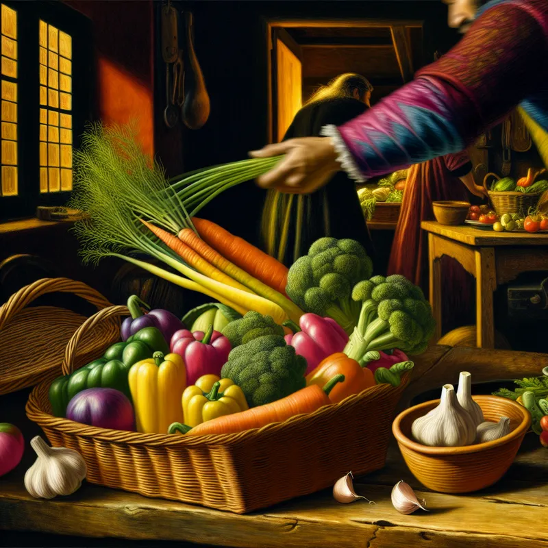 Kleurrijke keuken met verse groenten in een open voedselcontainer op een rustieke houten tafel.