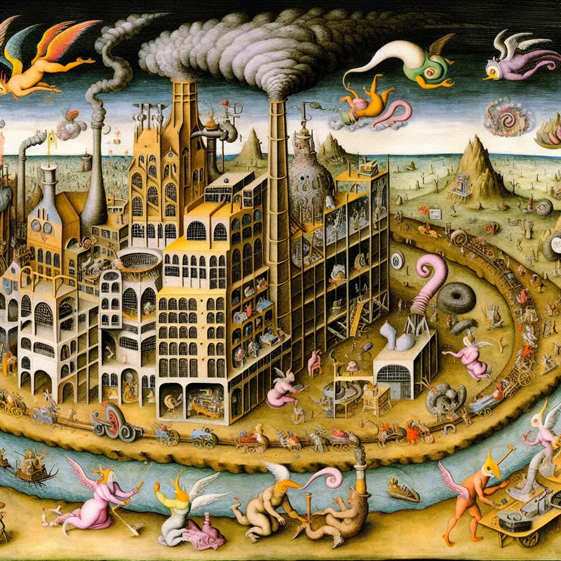 Surrealistische afbeelding van een grote internationale onderneming met bizarre werkomgevingen en vreemdelingen die producten creëren, geïnspireerd door Hieronymus Bosch.