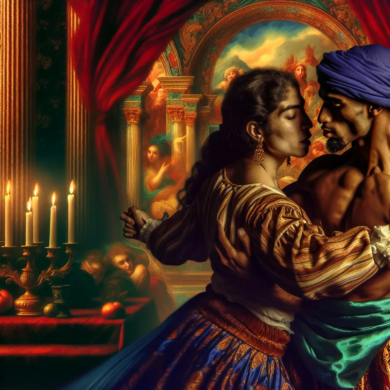 Twee figures in een intieme omhelzing in een barokke setting met zachte kaarsverlichting.
