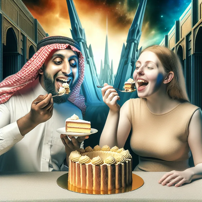 Twee mensen proeven samen een heerlijke taart in een hyperrealistisch tafereel met surrealistische elementen