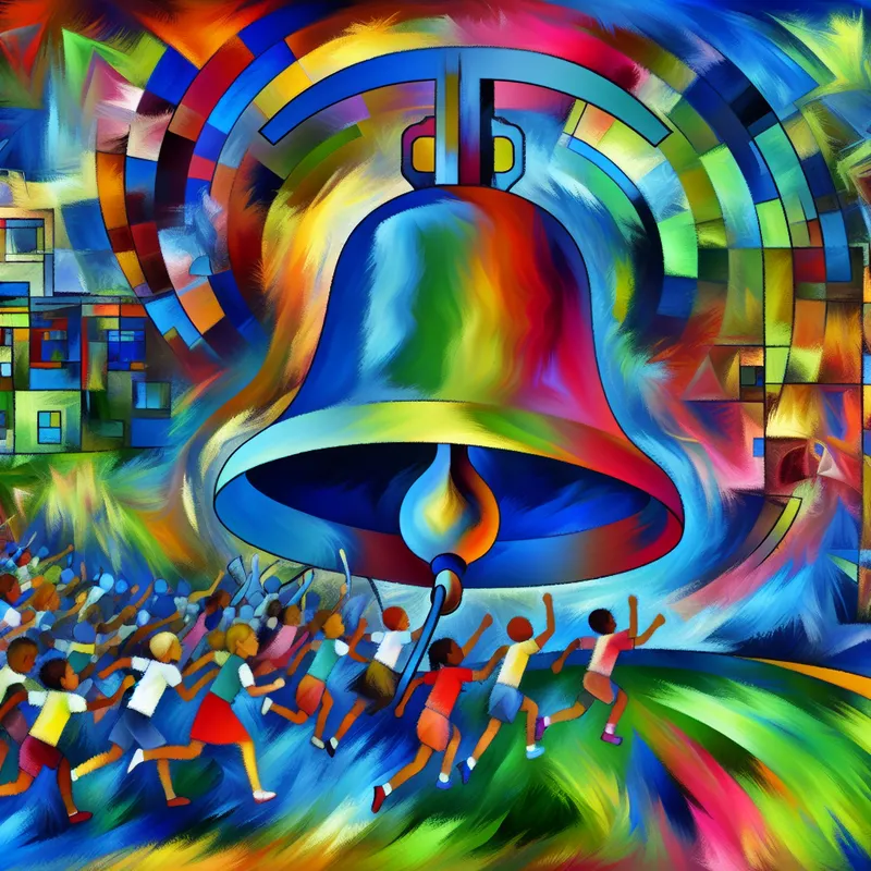 Vibrant abstract schoolbel die om 8 uur 's ochtends luidt, met kinderen die naar de bel rennen