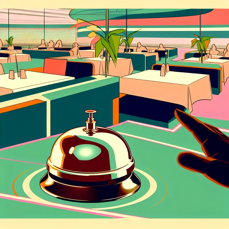 Een retro-futuristische illustratie van een vintage bel op een restauranttafel, met een hand die deze aanraakt.