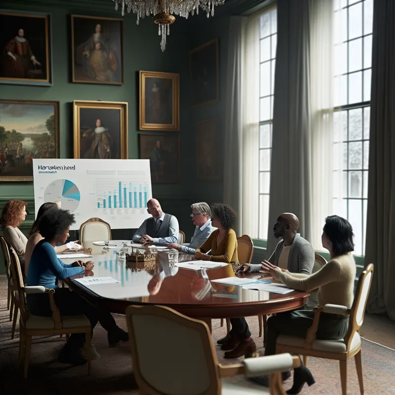 Een diverse groep mensen rond een tafel in een rechtbank, gefocust op juridische documenten, met een serieuze en elegante sfeer.