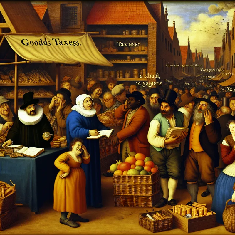 Drukke markt met mensen bezig met belastingzaken, waaronder een gefrustreerde winkelier en een vriendelijke belastingambtenaar.