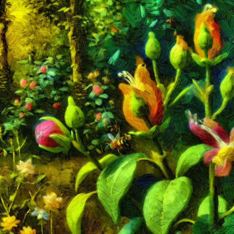 Bloeiende plant die overgaat in een vrucht na bevruchting, met bijen en vlinders in de omgeving