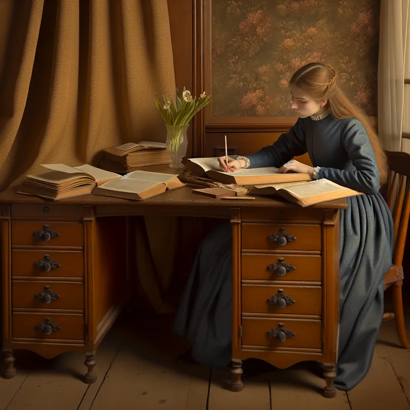 Jonge vrouw geconcentreerd aan een prachtig ingericht bureau, bezig met haar huiswerk.