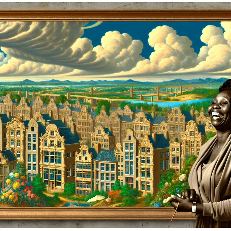 Een vrouw op een balkon die vrolijk uitkijkt over haar elegante appartement in een prachtige stad met klassiek Nederlandse architectuur en veel groen en bloemen.