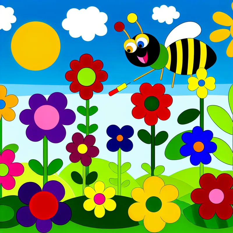 Vrolijke tuin met kleurrijke bloemen en een blije bij die rondvliegt