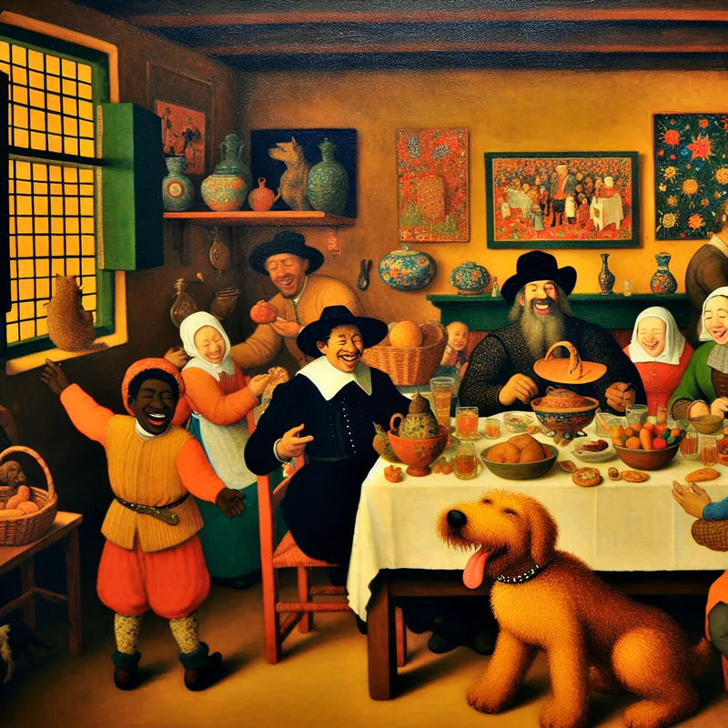 Een levendige scène van een gezin rond een grote tafel vol voedsel, met een kind dat enthousiast wijst naar een grote hond.