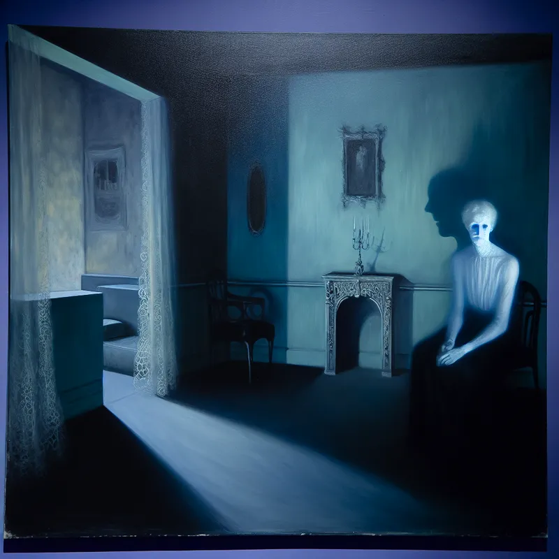 Een figuur met een bleke teint staat in een zachtblauw verduisterd vertrek, omringd door delicate gotische elementen.