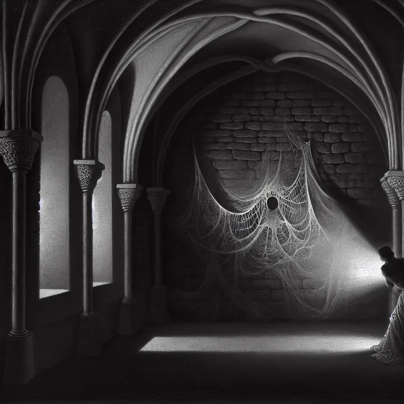 Een duistere kamer met een verlicht, intriciek object bedekt met spinnenwebben, terwijl een verraste figuur het ontdekt.