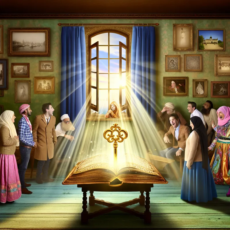 Groep mensen in een vintage kamer die een boek met een gouden sleutel erop bestuderen, met een grote raam op een zonnige dag.