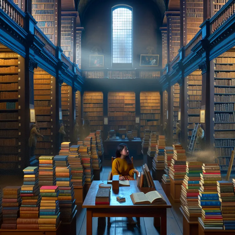Een jonge vrouw zit aan een houten tafel in een rustige bibliotheek, omringd door een enorme verzameling boeken met kleurrijke covers.