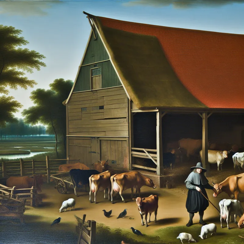 Op de boerderij staan een grote stal en een rood dak.