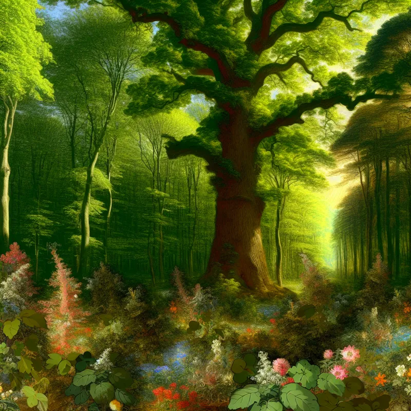 Een majestueuze eik staat trots in een zonnig bos met weelderige groene bladeren en verschillende bosdieren.
