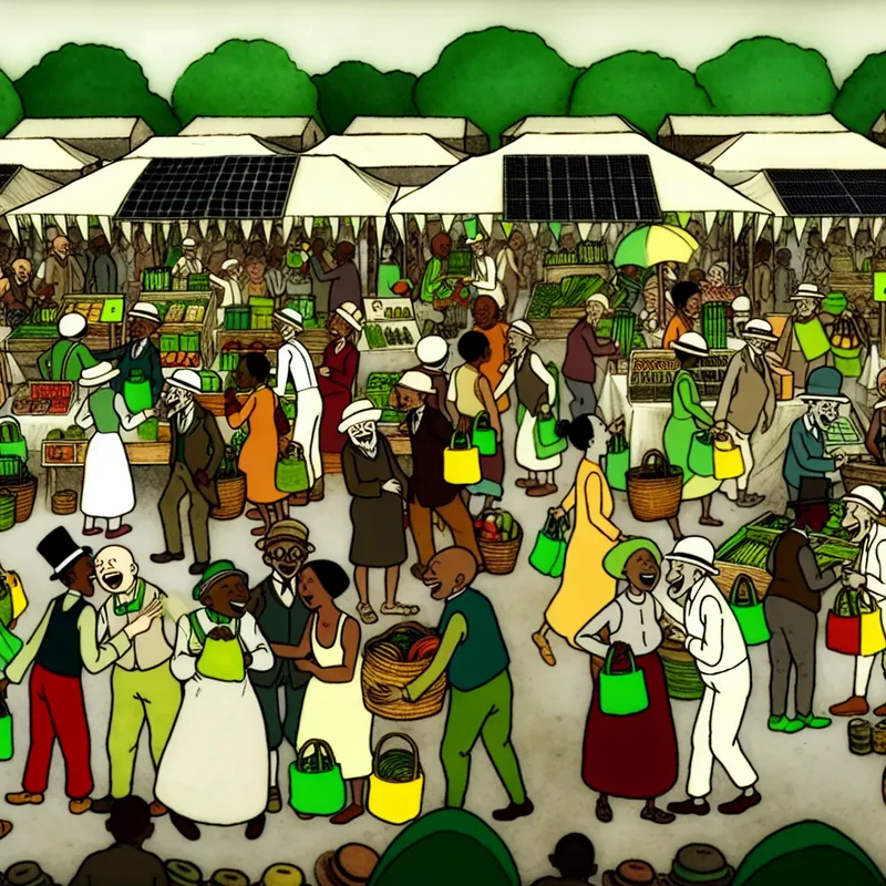 Een levendig cartoonesk tafereel van een drukke markt met diverse mensen die enthousiast duurzame producten kopen.