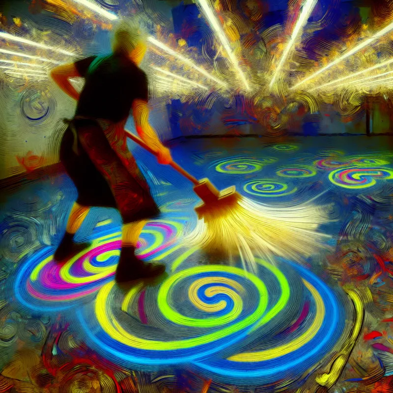 Een energieke persoon borstelt een kleurrijke vloer tijdens een schoonmaaktaak.