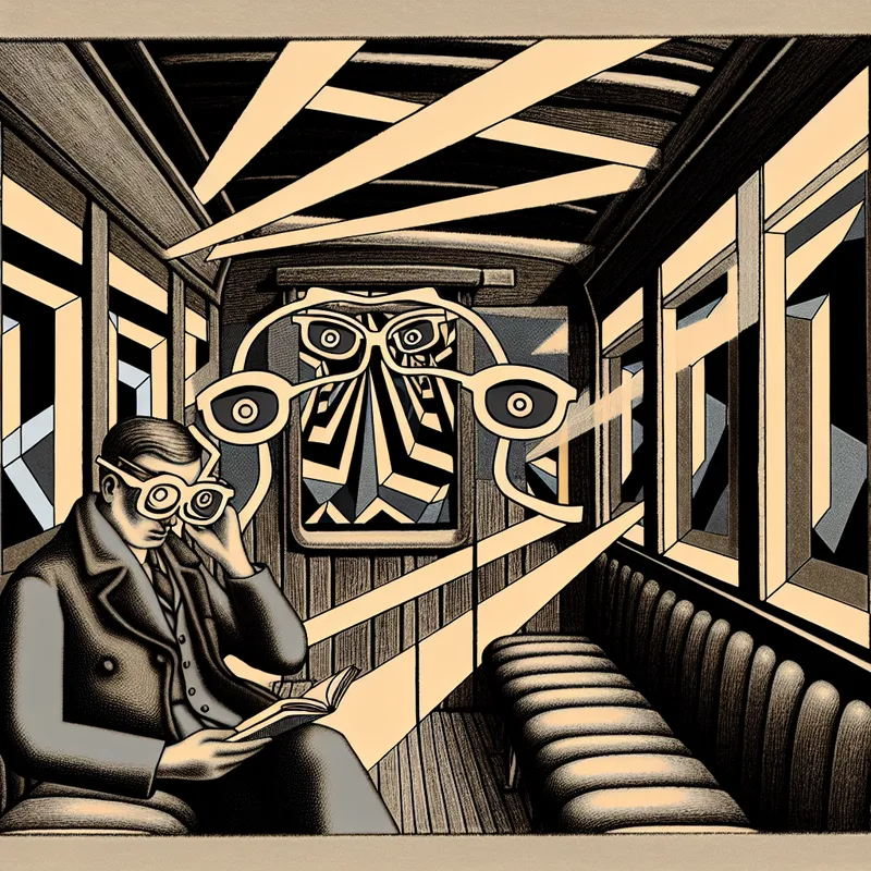 Een persoon met een grote bril leest een boek in een treincompartiment met geometrische patronen en surrealistische elementen.