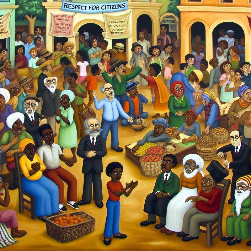 Illustratie van burgerschap met dorpsbewoners in een levendig plein, die deelnemen aan een gemeenschapsdiscussie.