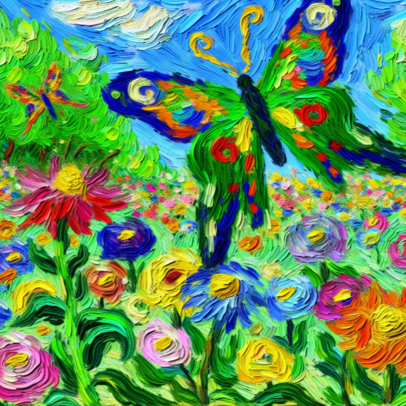 Een kleurrijke tuin met een vrolijke vlinder die van bloem naar bloem fladdert, onder een stralende blauwe lucht.