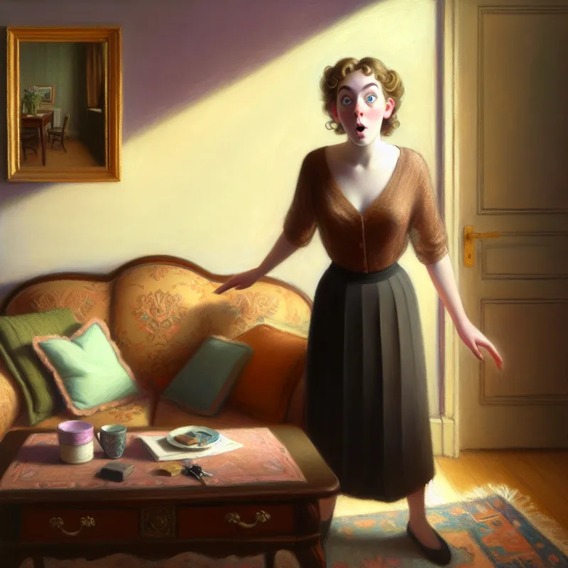 Een verraste jonge vrouw in een gezellige woonkamer roept 'Chips!' terwijl ze haar sleutels op de salontafel ontdekt.