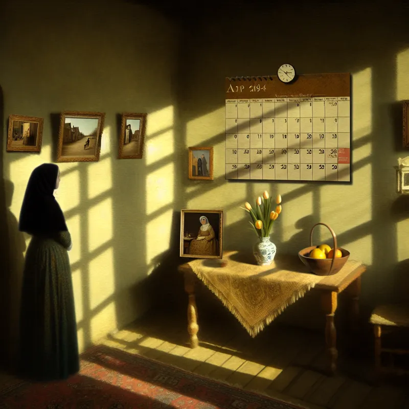 Een serene familie woonkamer met een kalender die de datum van vandaag toont, omringd door familieherinneringen en zachte verlichting.