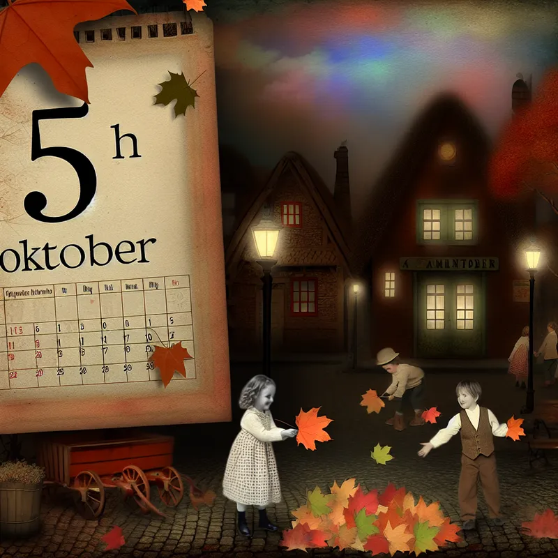 Een vintage kalenderpagina die '5 oktober' toont, omringd door herfstbladeren en een schattige straat met lampen op de achtergrond.