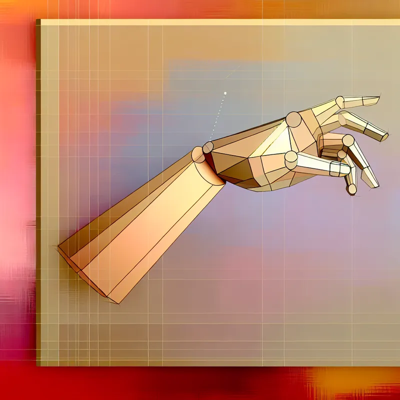 Een moderne illustratie van een arm die zich uitstrekt met een geometrisch abstracte stijl, geïnspireerd door Jan van der Veken, met een duidelijk gedefinieerde hand en een vervagende achtergrond.