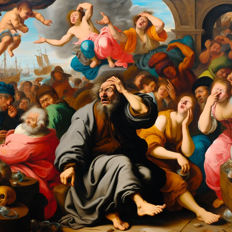 Een verwarde man in een levendige Barokke markt, omringd door nieuwsgierige voorbijgangers die vragen stellen.