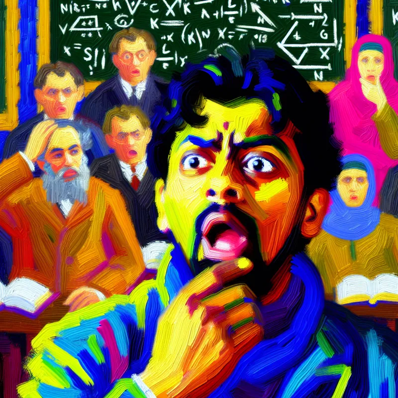 Een persoon in een chaotische omgeving kijkt verward en overweldigd, omringd door boeken en een schoolbord met complexe wiskundige vergelijkingen, wat een contrast vormt met de slimme mensen om hen heen.