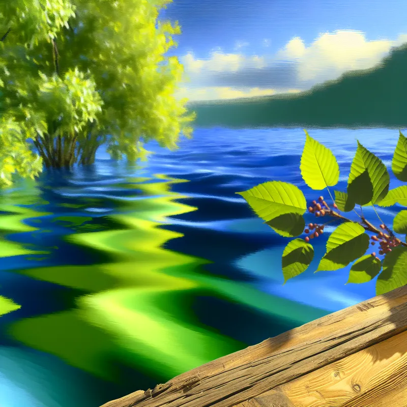 Een collectie van groene bladeren drijft op een blauwe meer, omringd door dappled licht en een rustiek houten plank.