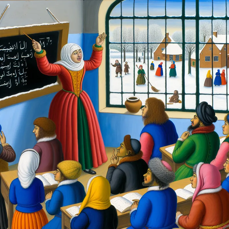 Een lerares legt een woord uit aan studenten in een vrolijke klaslokaalomgeving met een sneeuwlandschap buiten.