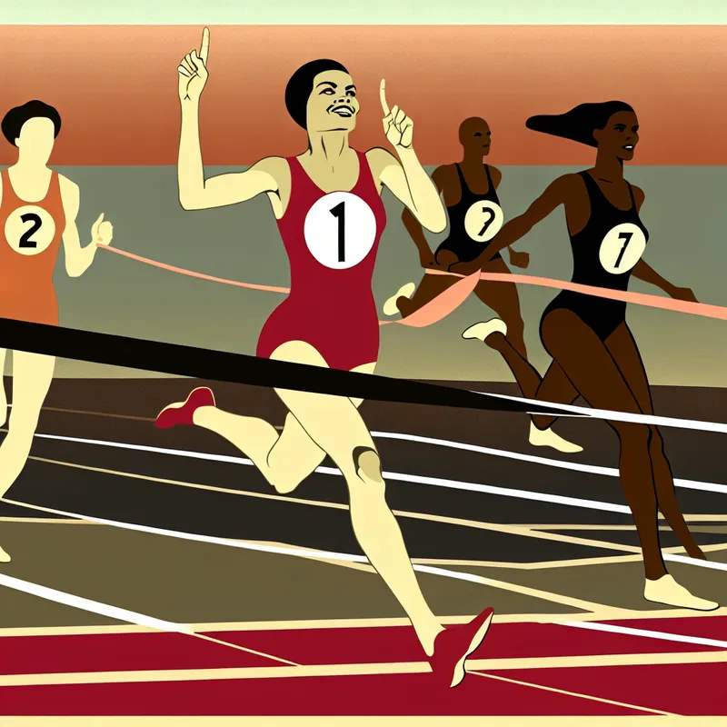 Een enthousiaste hardloper met het nummer één die de finishlijn oversteekt in een zonnige omgeving, omringd door blurende concurrenten en juichende toeschouwers.