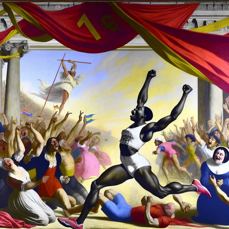 Vrouw steekt als eerste de marathonfinish over, armen in overwinning