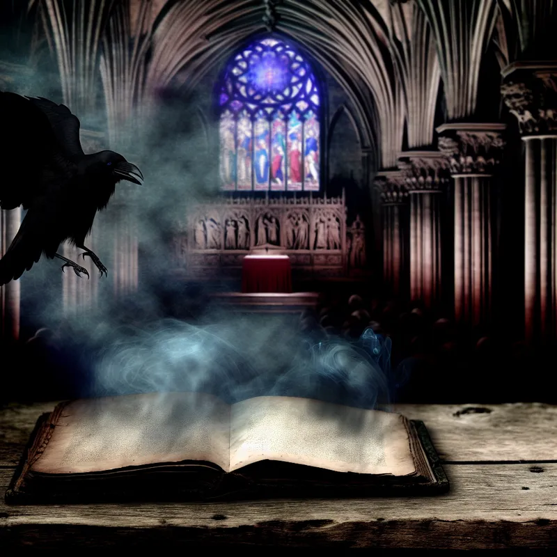 Een oude, open boek ligt op een houten tafel, omgeven door een mysterieuze sfeer. Rook kronkelt uit de pagina's terwijl een kraai toekijkt en kleurrijk licht door glas-in-loodramen valt.