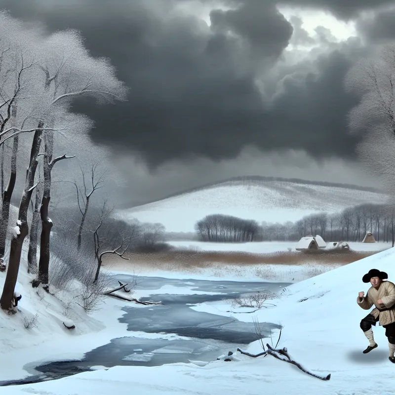 Winterlandschap met besneeuwde bomen en een bevroren rivier, met een figuur die het koud heeft en handschoenen vasthoudt.
